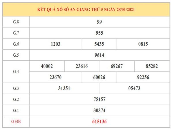 Phân tích kết quả XSAG 28/1/2021 kỳ trước với giải đặc biệt, giải 8, lô về nhiều nháy, đầu số về nhiều và lô câm chi tiết nhất giúp người chơi đưa ra được dự đoán XSAG 4/2/2021 chuẩn xác nhất.